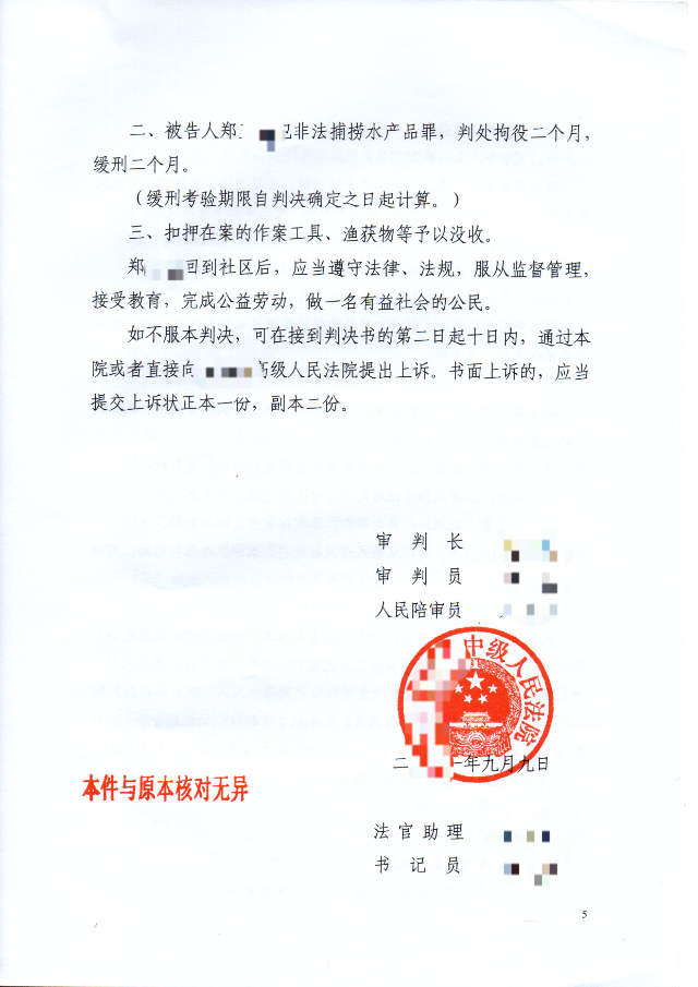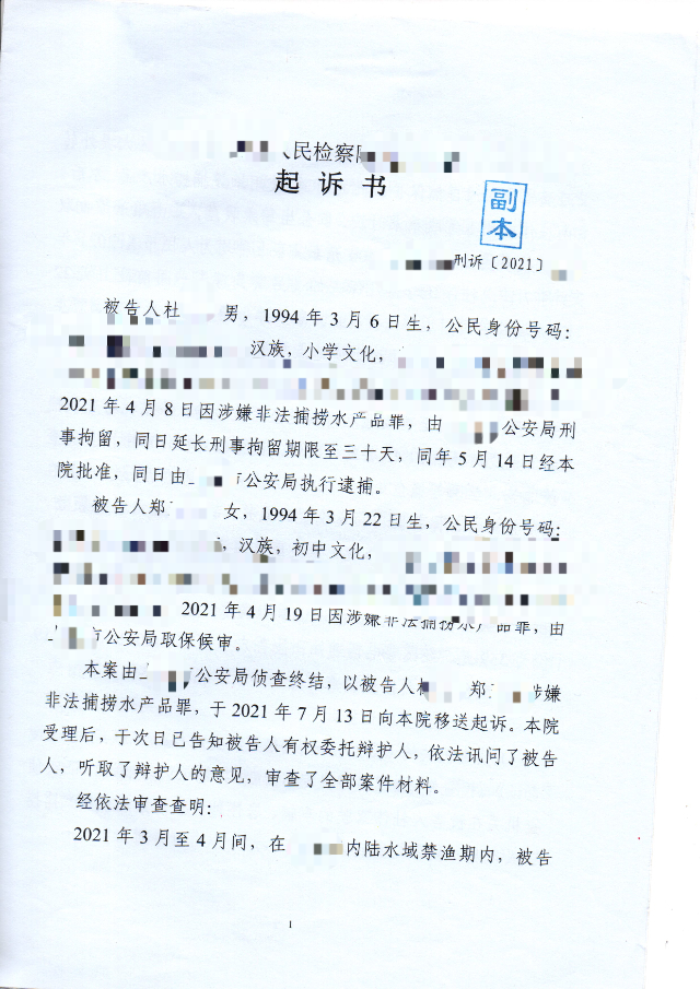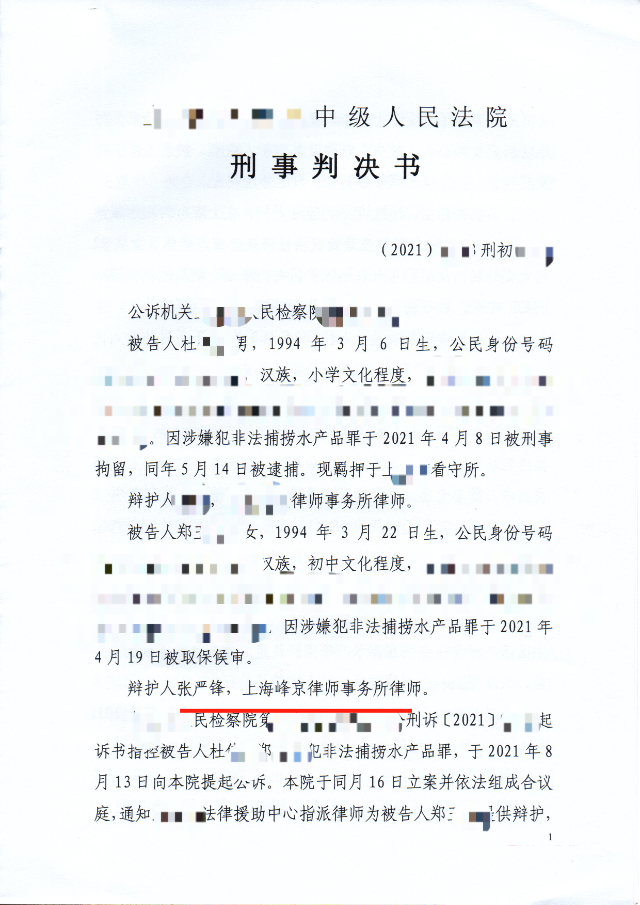 上海峰京律师事务所张严锋办理郑某某非法捕捞水产品罪一案。2021年3月至4月,被告人杜某与郑某某违反保护水资源法规,在上海市内陆水域禁渔期间,捕捞水产品价值1万余元。