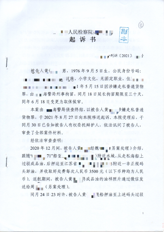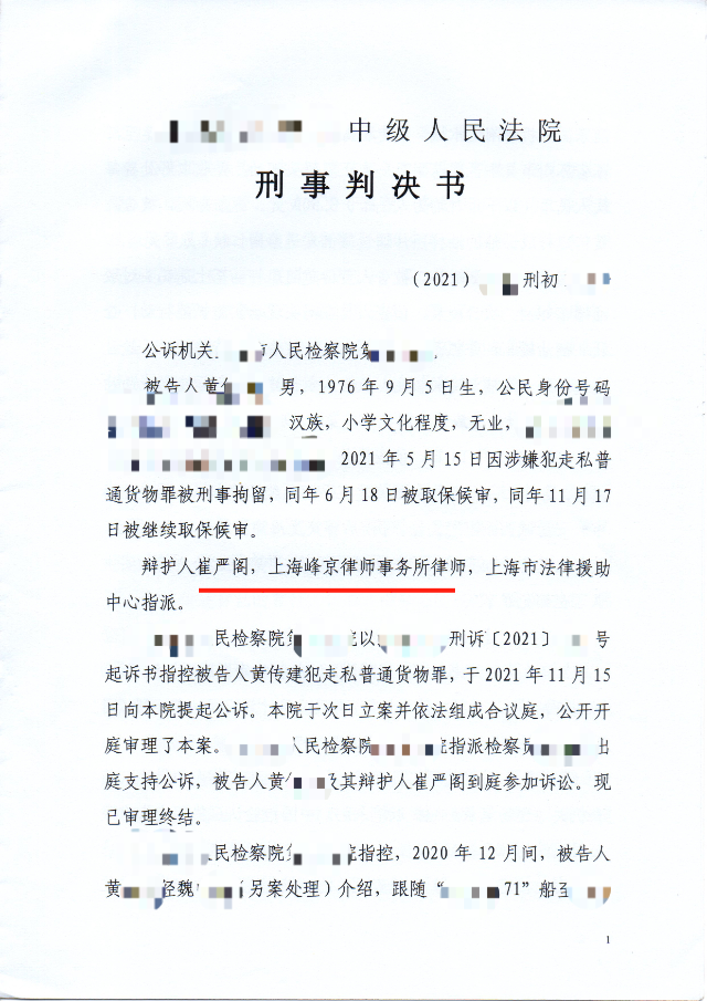 上海峰京律师事务所崔严阁办理黄某某走私成品油一案。2020年12月间,被告人黄某某明知他人实施走私活动,扔经他人介绍受走私团伙雇佣,先后4次跟随船只在海上过驳成品油,后押运至苏州附近一非正规码头卸油,并从中收取好处费。经上海浦江海关核定,黄某某共计偷逃应缴税额530余万元。